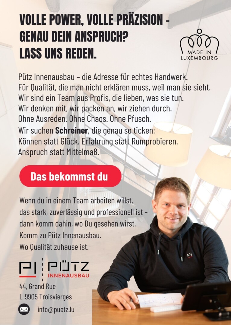 Jetzt kontaktierenDann werde Teil von Pütz Innenausbau und arbeite dort, wo Präzision zählt.